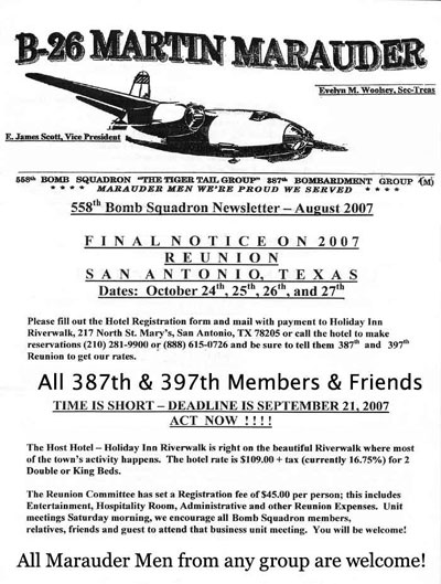 Bad Penny and The Bad Penny 2nd. When I had 49 missions in--on 26 March 1944, I was advised that I was selected among 10 gunners from the 4 oldest B-26 Groups in England, to be sent back to the States to attend Gunnery Instructors School, and that I was thru flying combat missions--awaiting orders down from 9th AF HQ....as a fluke, I wound up on a what was originally scheduled "local" flight, to get my flying time in for April, before leaving. That "local" with a crew other than my regular crew was during the night, changed to a combat mission, and I had no choice but to go on it...since the Sq CO was in London on pass. I went, we got the shit shot out of us...I picked up a small piece of flak in the upper lip, hydraulic system shot out, had to crank the flaps down, no brakes, had to pull the air bottle and the locked wheels blew the tires...My orders were waiting me when we got back, and I left the next morning, came back on the Dutch liner Nieuw Amsterdam. I was not yet 19 when I returned to the States.. I wound up at Lake Charles Army Air Base, LA, where I met my future wife, an AirWac working in Base HQ.. We were married on 9 July 1947... Celebrated our 60th last July. We were discharged in July 1945...I re-enlisted in August 1946...Flew on the Berlin Airlift as flight engineer...Received a direct commission as 2/Lt via Board Action....from enlisted to officer duty on 15 August 1950...aircraft maintenance officer...Was made a regular officer in 1957, and spent the last three years as an Atlas-F missile maintenance officer....retiring voluntarily in the grade of regular major, on 1 March 1965..at age 39... I spent seven years as Plant Manager of a 535-bed hospital in Knoxville.. and six years as the Grainger County Juvenile Court and Probation Officer....calling it Quits in 1982.... We live 25 miles ENE Knoxville at Rutledge. TN... I'm mentioned in a couple of 386th missions, Chester Klier's Mission #8 and Mission #25. Take Care, Billie B. Boyd Jr. |
