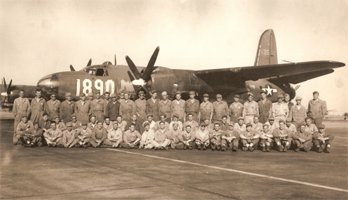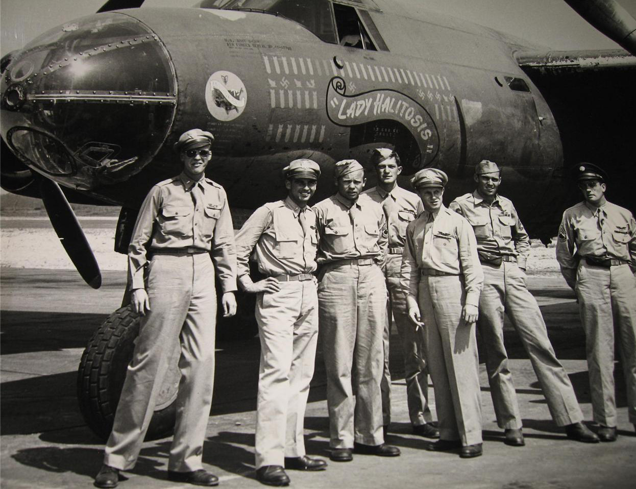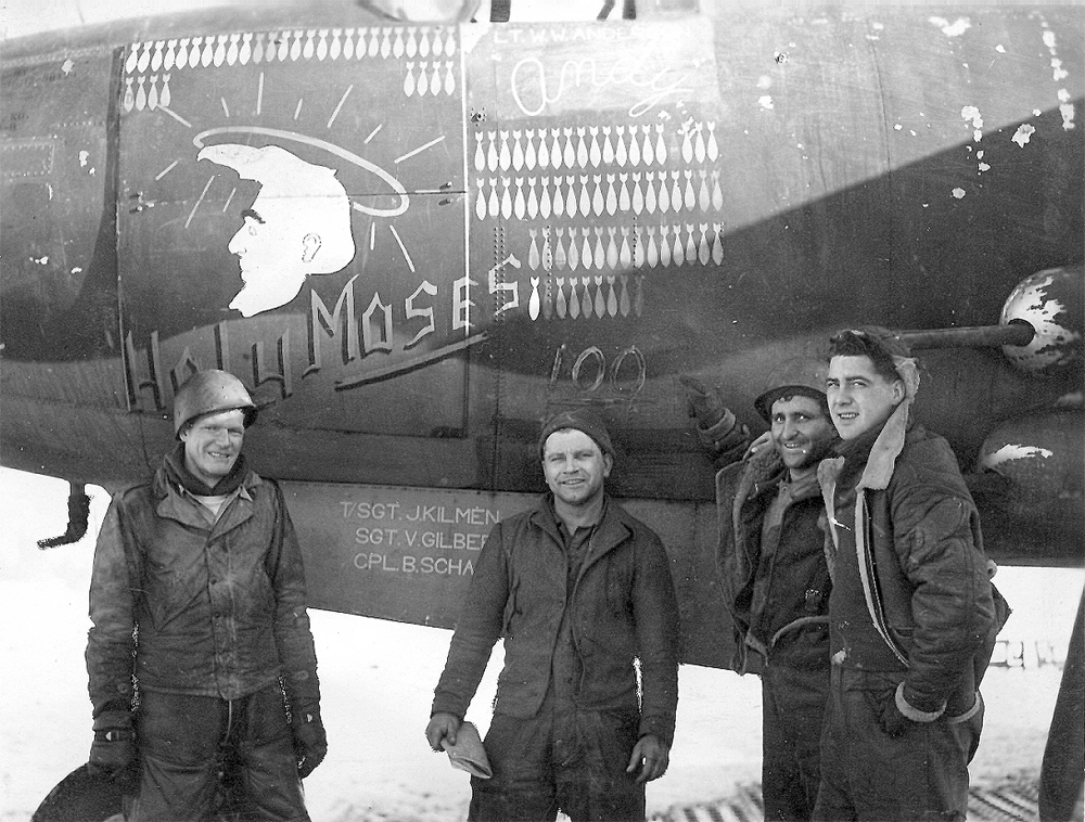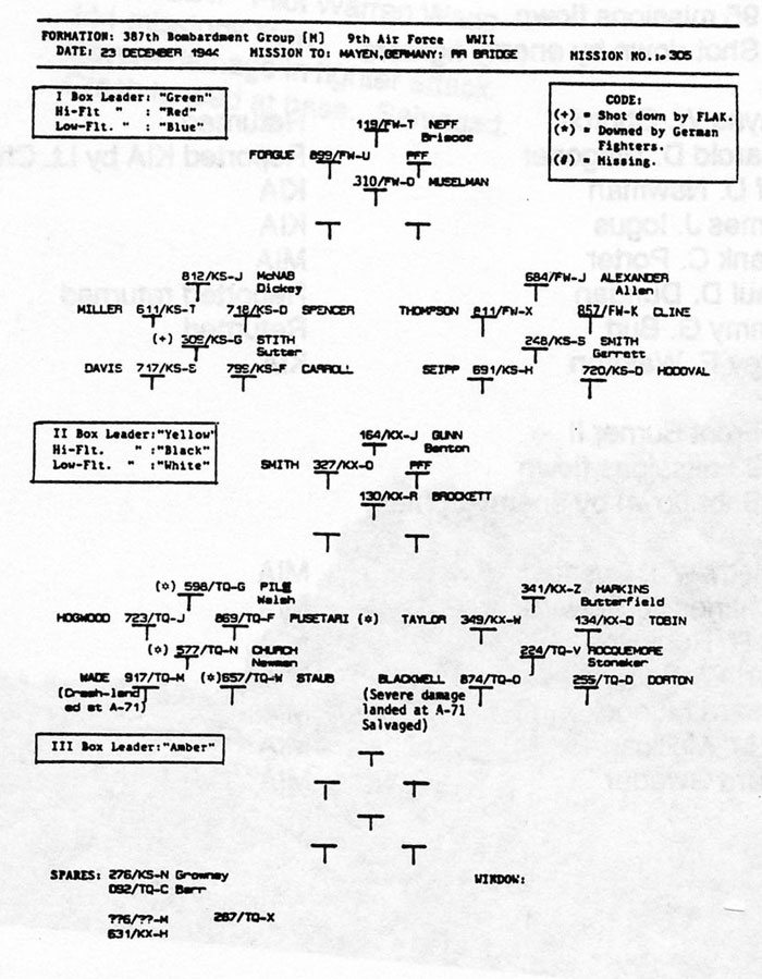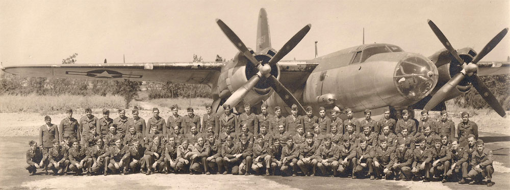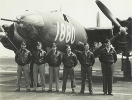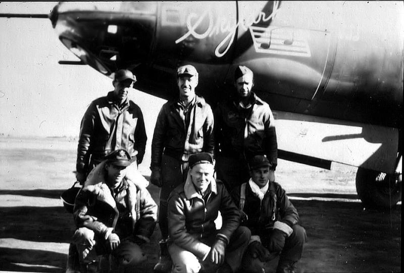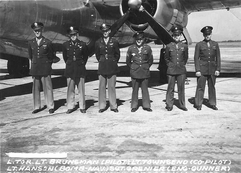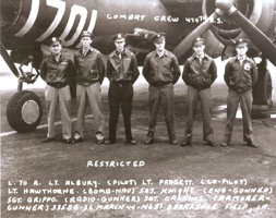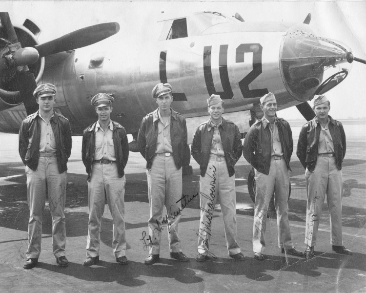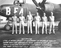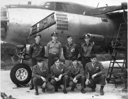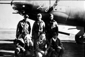 Beaver - Huen, Brown Mule - Prow. Ellie. Daniel M. S. Singleton, Pilot, 394/587; Thomas V. Leask, Co-Pilot, 394/587; Normal J. Schmit, Bombardier, 394/587; Gerald E. Skinner, 394/587; Donald L. Rilling, 394/587; James W. Parish, 394/586; Dennis H. Lennon, 394/587; Frank M. Kirbe 394/585; William H. Bates or Frederick H. Bates; Huen (Unknown); Carl G. Prowatzke, 394th BG |