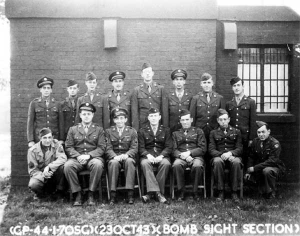 October 23, 1943 - 386th Bomb Group Back Row: All men are unidentified. Front Row: Second from left, Arthur Carroll Wright Unidentified personnel from the 386th Bomb Sight Section are shown outside the bomb sight building. Note bars on the window. This crew had the responsibility of maintaining the Norden Bomb Sights used by the 386th Group lead and deputy lead aircraft. If you know the names of any of these individuals please let us know. |