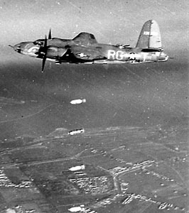 | Wednesday, November 3, 1943--386th B.G. Mission No. 37. Target: Airdrome, located at Amsterdam Schiphol, Holland. "BUZZ-N-BITCH II" 131953 RG-T piloted by Lt. Ansel Brandstrom as four 1,000 pound bombs are unleashed on the target at 1552 hours. | Armando Madeira 552 BS, 386th BG. Air Combat Photographer shown at his waist window position. He flew 50 missions with 22 different pilots. He made hundreds of air shots, also took photos of crews posing with their aircraft. He was credited for saving the life of Lieutenant John Bryant on 386th Group Mission Number 142. |