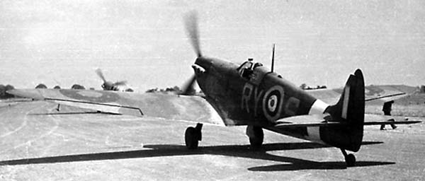 Spitfire RY-S Czechoslovakian 313 Squadron begins to taxi out for a combat sweep. |
