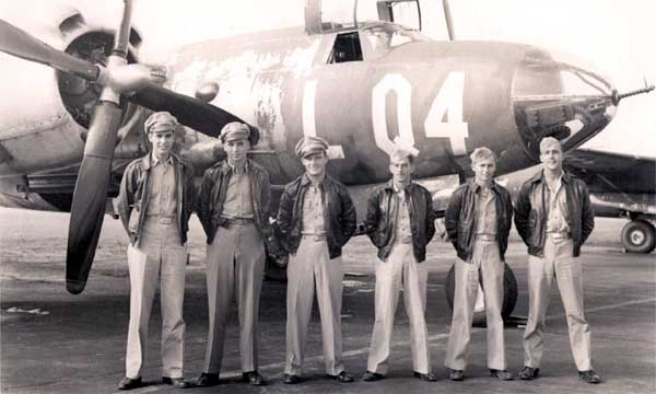 Eckard Munsch Jr. Standing in front of it is the pilot, Mathew J. Pusateri (Buck); co pilot, J. B. Trump (Jim); Harold Ovis (Hot), Robert W. Philp (Squeaky), Eckard Munsch Jr. (Joey), and John R. Robinson (Robbie.) The plane crashed on December 23, 1944, at Junkerath, Germany. J. B. Trunp and Harold Ovis were not flying on it that day. Charles C. Seward Jr, Howard Shweder and William M. Mullican were. All of them died. |