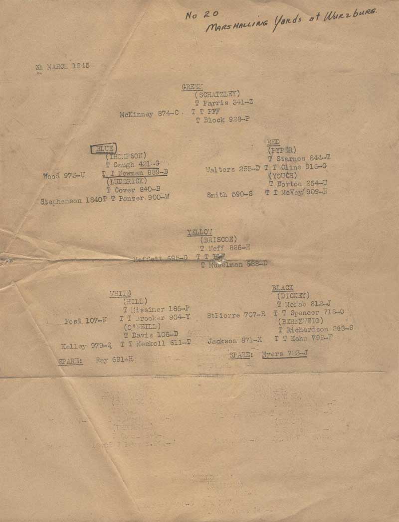 ![]() L-R Lt. John E. Newman, Waterville, Ohio; F/O Arthur Cattlett, Linwood, KS; F/O Ernest W. Hardy, Neosho, MO; Nathan J. Pearson, Leesburg, AL; Virgil “Bud” Haley, Carlsbad, NM; Robert B. Hall, Huntingdon, PA. Mr. John Newman is alive and well! |
