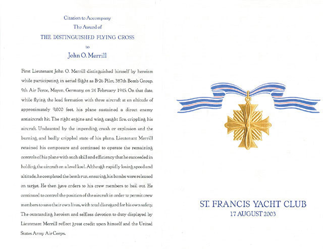 Presentation by John Kern: "Thank you, Elizabeth. I am honored and very pleased to be here today. I have known John Merrill for about 3 years. We met through the walking group at the San Francisco Yacht Club. Each morning we meet at the club, get a little exercise, drink some coffee and talk about the news of the day and usually a variety of other things. It took only a few days of knowing John before I realized I was in the presence of a special man. I learned that he had been a senior partner at Skidmore, Owings and Merrill, one of the country's most prestigious architectural firms. Almost every major city in the country has a landmark building or a corporate campus or a sport stadium or an airport terminal that was designed by his firm. John has had a very special career in the field of architecture. But we're not here today to honor John for his civilian achievements. Today, we are honoring John for a completely different career at a much earlier time in his life - his military career. More specifically, we're here to honor John for his heroic actions on a particular day in his military career. Let me take you on a brief verbal tour through John's military life. In 1942, at just 19 years old and during his sophomore year at the University of Wisconsin, John enlisted in the Army Air Corp as an aviation cadet. By October of that year, he was enrolled in preflight school at Santa Ana California. Preflight, as the name implies has very little to do with airplanes. Its primary focus is on the onerous task of taking a civilian kid and converting him into a military man. John made the conversion without major problems. He then began his flight training, which occurred in three specific phases at three different locations: The first phase - Primary flight training was at Tulare Army Air Base flying the PT 17, the open cockpit Stearman. The second phase - Basic flight training was at Merced Army Air Base flying the Vultee BT 13. A more complex aircraft with landing flaps and a constant speed propeller. I believe air to ground communication was also introduced during this period of training. The Advanced phase took place at Yuma Army Air Base. Here John flew the North American AT 6, commonly known as the Texan, the Cessna AT 17 and the Curtiss AT 9. The last two being twin engine aircraft with retractable landing gears. Within one year, he had completed all three phases of his flight training and just 2 days before his 20th birthday, John received his Pilot's Wings and was commissioned 2nd Lt. in the Army Air Corps. At this time, John was granted a two week leave. This brand new military pilot walked into his hometown in Minnesota in a handsomely tailored and crisply pressed Army Air Corps uniform. His full head of hair neatly coiffured, the shiny gold bars on his epaulets and pilot's wings on his chest were like magnets to the young ladies in town and, instantly, John was the subject of their praise and adulation. After two wonderful weeks, a fatigued but very happy 2nd Lt. Merrill reported for duty at the Transition Training School at Mather Army Air Field, Sacramento, California. Although John had his pilot's wings, none of his previous flight training had been in warplanes. At Mather, he would apply all of his previous pilot training toward fine tuning his skills in a specific aircraft, the Mitchell B25 medium bomber. Everyone wanted to fly the B 25 and John was delighted to get the assignment. It had already contributed significantly to the war effort and was the same bomber flown by Jimmy Doolittle and his Raiders in the famous attack on Tokyo in 1942. After mastering precision control of the B25 at Mather, John was sent to Greenville, South Carolina for combat flight training in the B25. John excelled in the combat training course. As we know, the military always uses the best and brightest in any program to teach incoming trainees so, of course, John was assigned as an instructor in the combat flight training school. In this capacity, he taught many pilots the art of precision skip-bombing, low-altitude flying techniques and proper use of the 75MM canon in the nose of the B25. John became a high-time military pilot as a result of his instructor tour of duty amassing nearly 900 hours of flight time. Most combat pilots had 250 hours or less by the time they flew their first combat mission. His tour of duty as an instructor came to an end in August 1944 when John was sent to an airfield outside Paris where he was assigned to the 9th Tactical Air Force, 387th Bomb Group, 559th Bomb Squadron. Guess What? The 559th was not a B25 Squadron. They flew the B26, commonly known as the Martin Marauder, and those who flew them were called Maraudermen. The B26 was a twin engine medium bomber like the B25 but it had significantly different aerodynamic and performance characteristics. But, with all the time and experience John had flying the B25 and because he was a superb pilot, he was able to transition easily to this different aircraft and in just 6 hours of flight he was checked out and certified as a B26 pilot. After his checkout he flew 6 combat missions in the B26 as co-pilot. Before his mission he was promoted to 1st Lieutenant, designated "first pilot" and assigned a regular crew. These crewmembers were fortunate to be assigned as John's crew because, as a very experienced and high-time pilot, John could coax extra performance out of an airplane. He could recover from unusual and unexpected attitudes where a less experienced pilot might not be able to do so. These skills would later prove to be valuable assets. He flew 14 missions as first pilot, many of which were in support of ground troops fighting the Battle of the Bulge. The Allies declared the Battle of the Bulge won on 28 January 1945. Then came the fateful day of 24 February 1945. John had a mission that day. It would be his 21'. He went to the briefing room to learn the details of the mission. He learned that the objective was to bomb