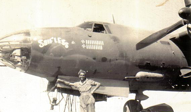 good close up of my Dad and the nose art. Dad's plane was called " SHIF'LESS" with the tail number 41-34999. I'll send the 442nd patch. My father was with the 12th army air corps, 33rd Battalion, 442nd squadron, 320th bomb group in Tunisia from may 1942 until march 1944 when he was sent to England and participated in the campaigns of Sicily, Naples-Foggia, Rome-Arne also the Air Offensive Europe and Anti Submarine patrols according to his service record which I have here. It's the old carbon copy record. His unit was given a Presidential Unit Citation on May 12th, 1944 for action above Fondi Italy in support of the advance of the 7th Army. His unit bombed in support of the Sicily landings, at Anzio, and Monte Cassino. His unit moved to France in November 1944 for support of operations bombing Germany and his service ended and he returned home on August 25th, 1945. He was born in Brooklyn