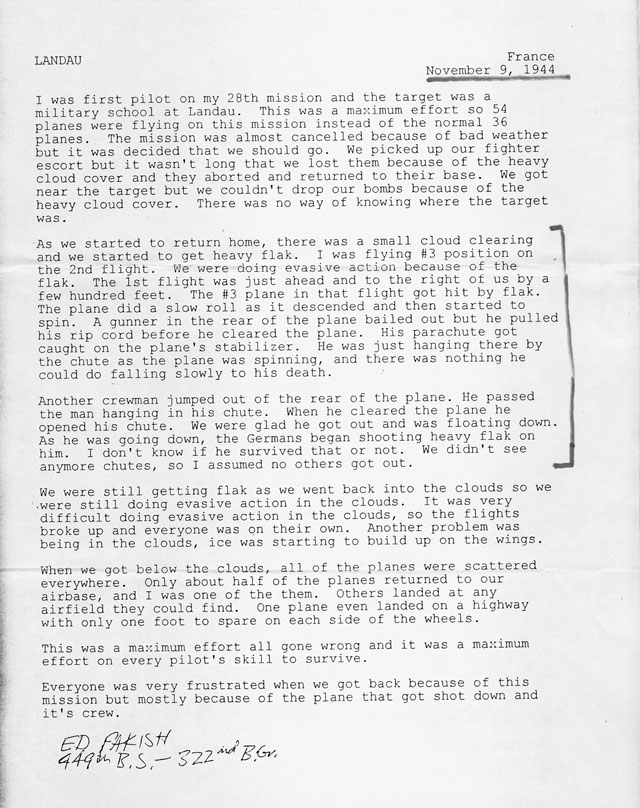 | LANDAU France November 9, 1944 I was first pilot on my 28th mission and the target was a military school at Landau. This was a maximum effort so 54 planes were flying on this mission instead of the normal 36 planes. The mission was almost cancelled because of bad weather but it was decided that we should go. We picked up our fighter escort but it wasn't long that we lost them because of the heavy cloud cover and they aborted and returned to their base. We got near the target but we couldn't drop our bombs because of the heavy cloud cover. There was no way of knowing where the target was. As we started to return home, there was a small cloud clearing and we started to get heavy flak. I was flying #3 position on, the 2nd flight. We were doing evasive action because of the flak. The 1st flight was just ahead and to the right of us by a few hundred feet. The #3 plane in that flight got hit by flak. The plane did a slaw roll as it descended and then started to spin. A gunner in the rear of the plane bailed out but he pulled his rip cord before he cleared the plane. His parachute got caught on the plane's stabilizer. He was just hanging there by the chute as the plane was spinning, and there was nothing he could do falling slowly to his death. Another crewman jumped out of the rear of the plane. He passed the man hanging in his chute. When he cleared the plane he opened his chute. We were glad he got out and was floating down. As he was going down, the Germans began shooting heavy flak on him. I don't know if he survived that or not. We didn't see anymore chutes, so I assumed no others got out. We were still getting flak as we went back into the clouds so we were still doing evasive action in the clouds. It was very difficult doing evasive action in the clouds, so the flights broke up and everyone was on their own. Another problem was being in the clouds, ice was starting to build up on the wings. When we got below the clouds, all of the planes were scattered everywhere. Only about half of the planes returned to our airbase, and I was one of the them. Others landed at any airfield they could find. One plane even landed on a highway with only one foot to spare on each side of the wheels. This was a maximum effort all gone wrong and it was a maximum effort on every pilot's skill to survive. Everyone was very frustrated when we got back because of this mission but mostly because of the plane that got shot down and it's crew. |
