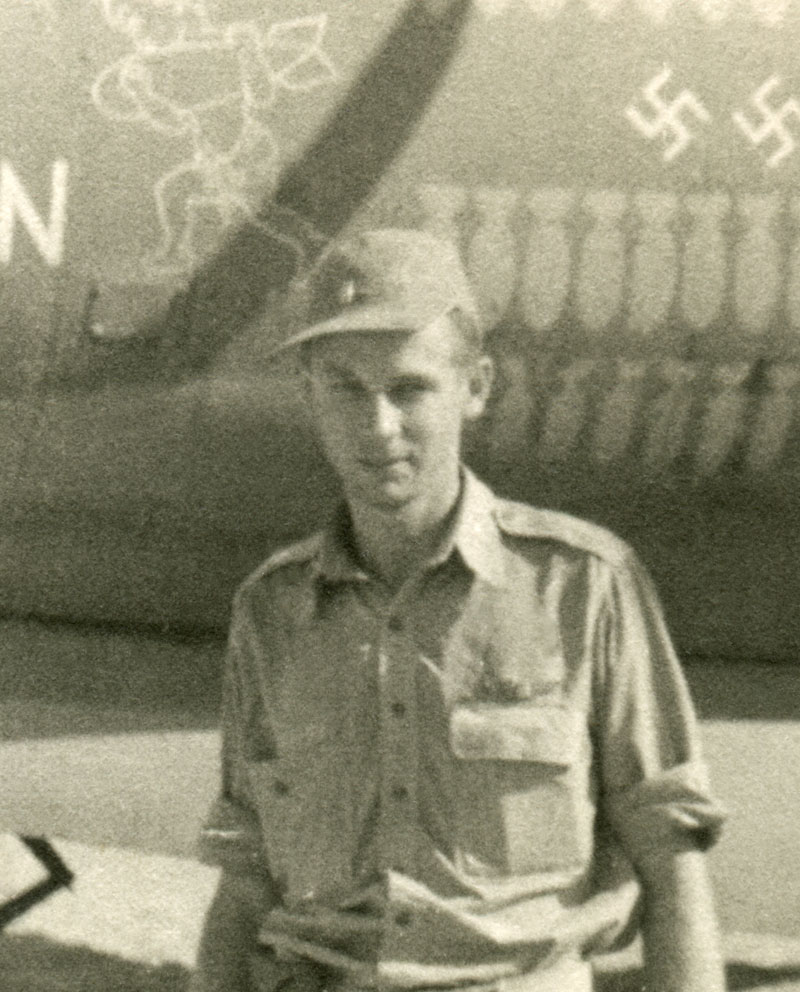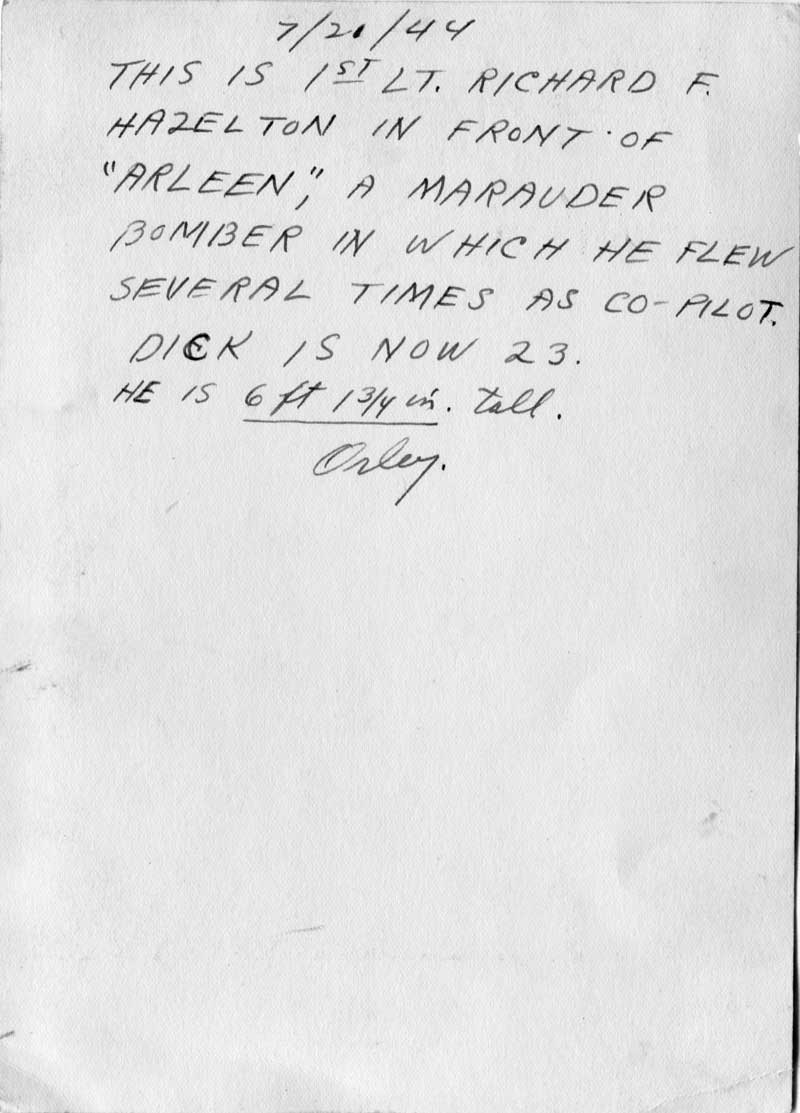 This is First Lieutenant Richard F. Hazelton in front of "Arleen", a